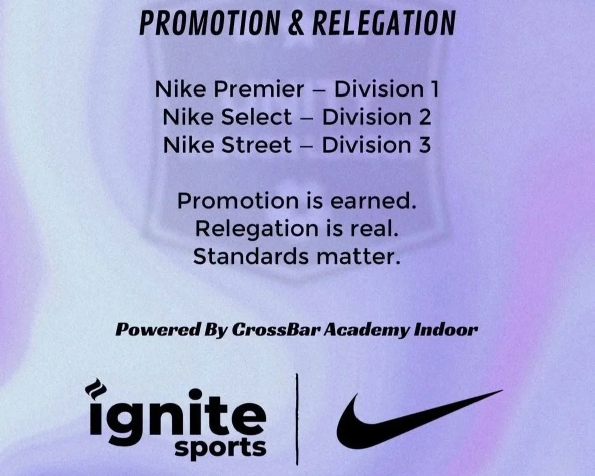 The league will feature a full promotion and relegation system, raising the level of competition across all divisions. The division structure includes Nike Premier Division 1, Nike Select Division 2, and Nike Street Division 3. In Unity Indoor League, promotion is earned, relegation is real, and standards matter. The league is powered by CrossBar Academy Indoor, adding even more strength and credibility to the project.