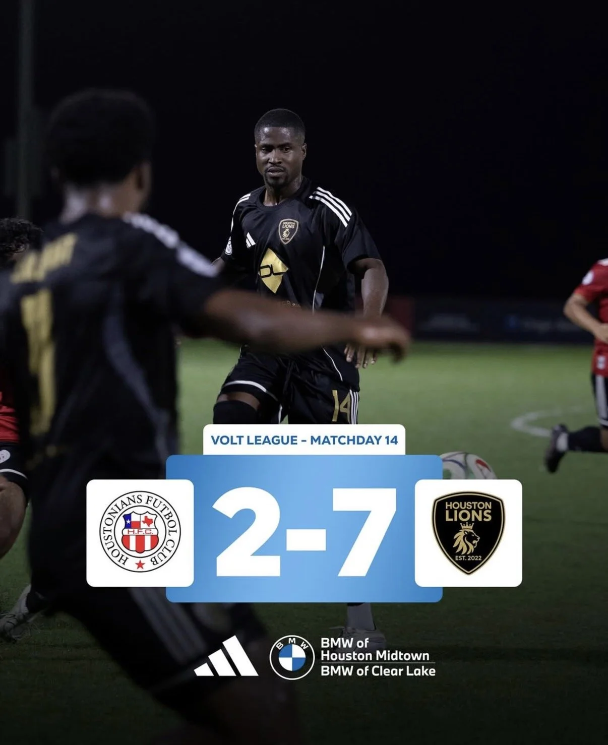 Matchday 14 of the Volt League saw a powerful performance from Houston Lions, who delivered a statement victory with a convincing 7–2 win over Houstonians FC on Saturday night.