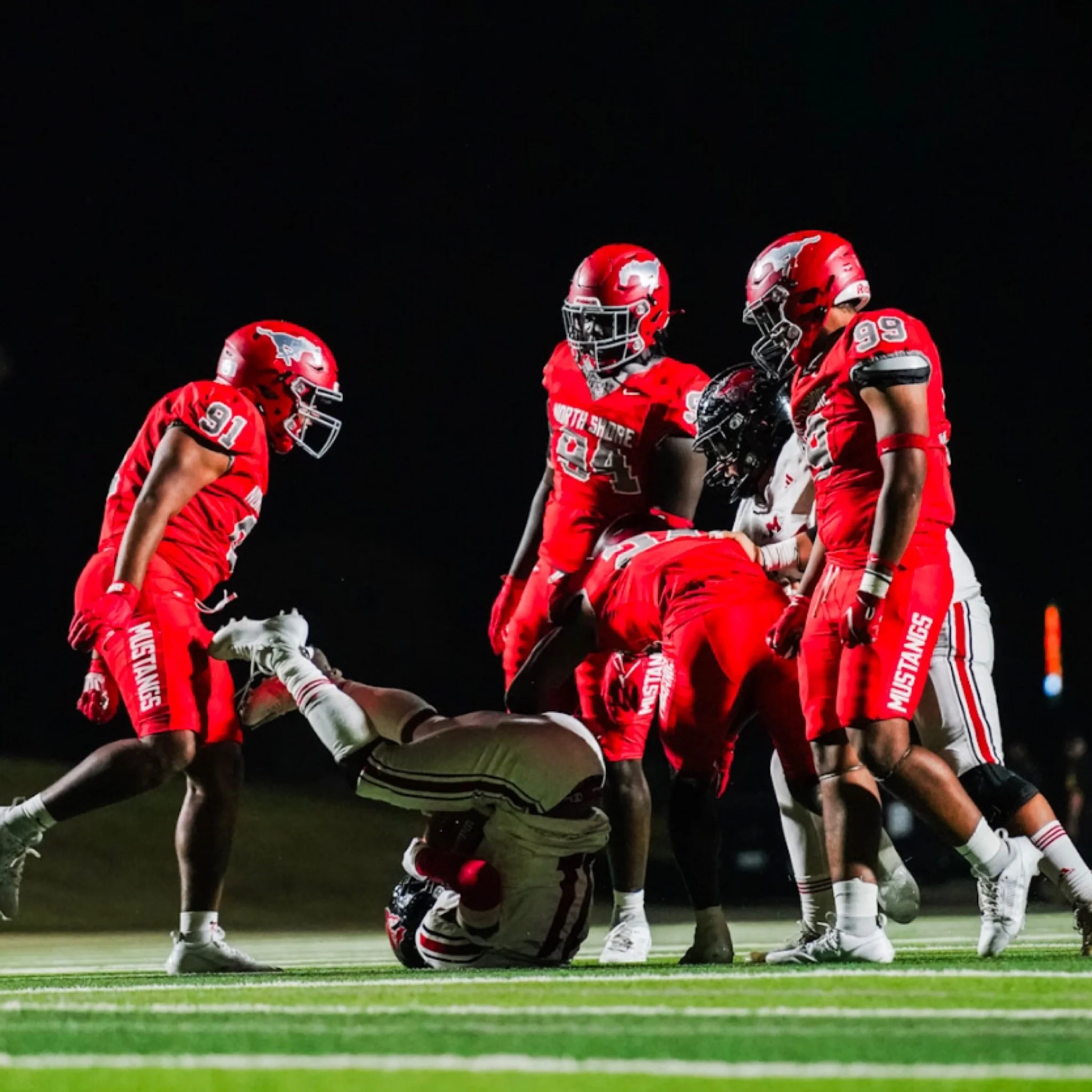 The game opened with a bang as Deion Deblanc broke loose for a 45-yard rushing touchdown, putting the Mustangs on the board first. (North Shore, 7-0 | 7:00). Shortly after, Dasean Royal recovered a fumble and returned it three yards for another touchdown, putting North Shore ahead with two rapid scores (North Shore, 14-0 | 7:00).