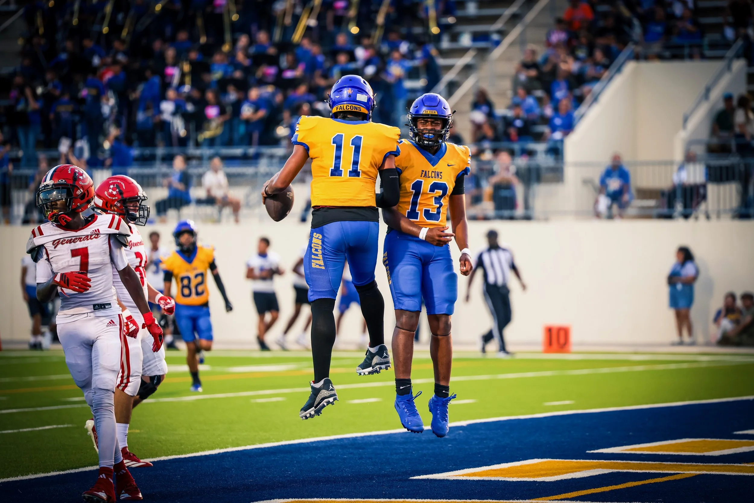 The Channelview Falcons football squad scored 42 points with big performances by #12 @DavionVanderbilt12 with 3 catches for 115 yards and 3 touchdowns and @its5ive_dari #5 Darius Myles with 17 carries, 127 yards 2 touchdowns while the Falcon defense limited the visiting MacArthur Generals to 21 in the Falcons non-league triumph on Friday.