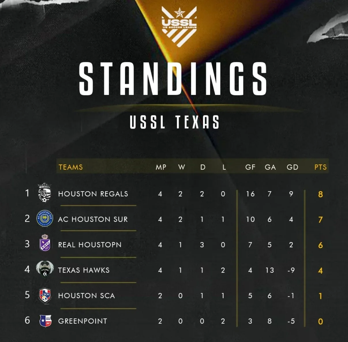 The bottom half of the table remains unchanged. Houston SCA sit in fifth with just 1 point, and Greenpoint are still searching for their first result of the season, holding down sixth place with 0 points. With each team having played four matches, the playoff race is heating up and every point is beginning to matter.