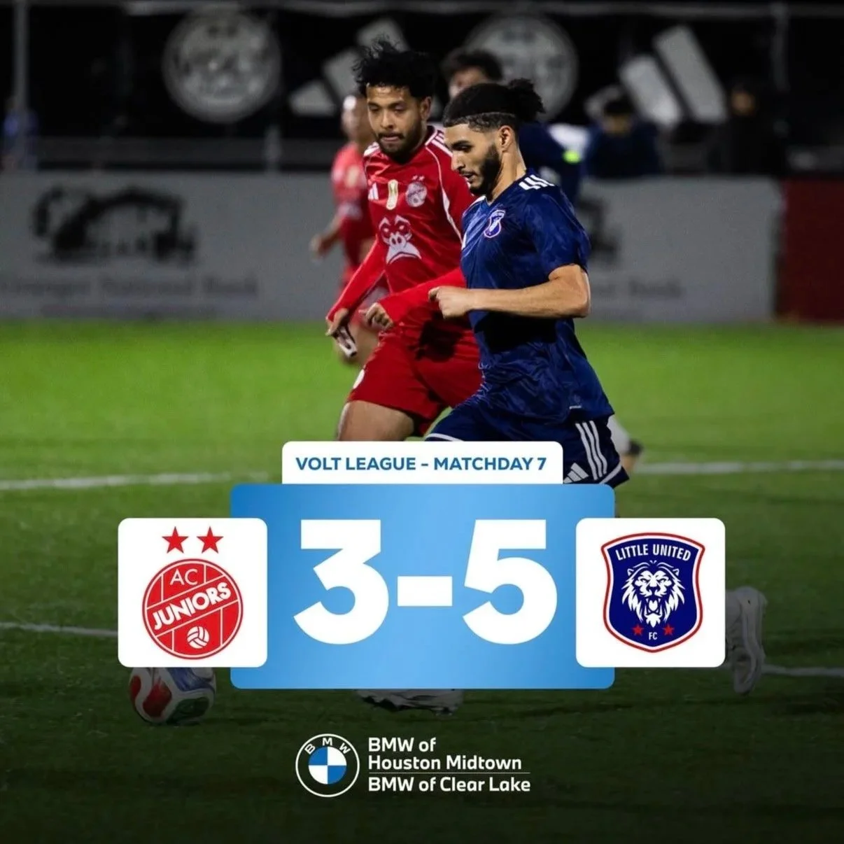 Little United FC earned one of the biggest wins of the weekend, defeating AC Juniors 5–3 in a thrilling top-four clash. Little United jumped out to an early lead with goals from #10 Mario Perez (11’), #17 (13’), and #8 Adrian Perez (18’). AC Juniors attempted to respond, but #99 (34’) added another for Little United before halftime.