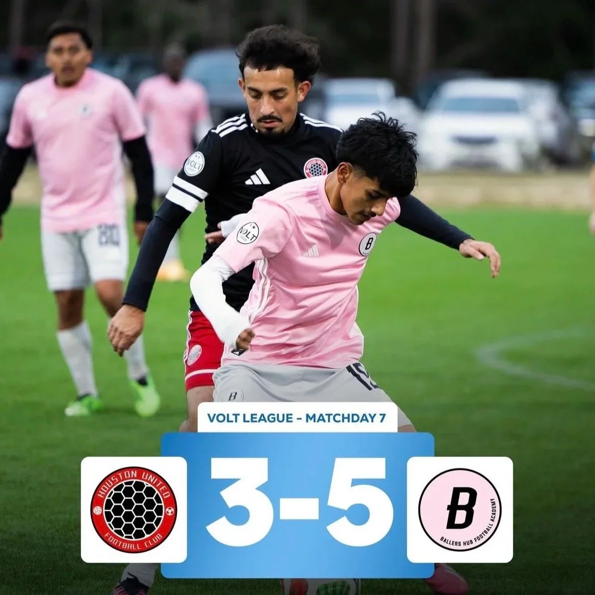 Ballers Hub FA continued their strong run of form with a 5–3 victory over Houston United FC. Ballers Hub FA #4 Ronald delivered a standout performance, scoring a hat trick in the 6th, 25th, and 67th minutes, setting the tone early and reasserting control in the second half. The match featured end-to-end action and goals on both sides, with Ballers capitalizing on key chances to pull away.