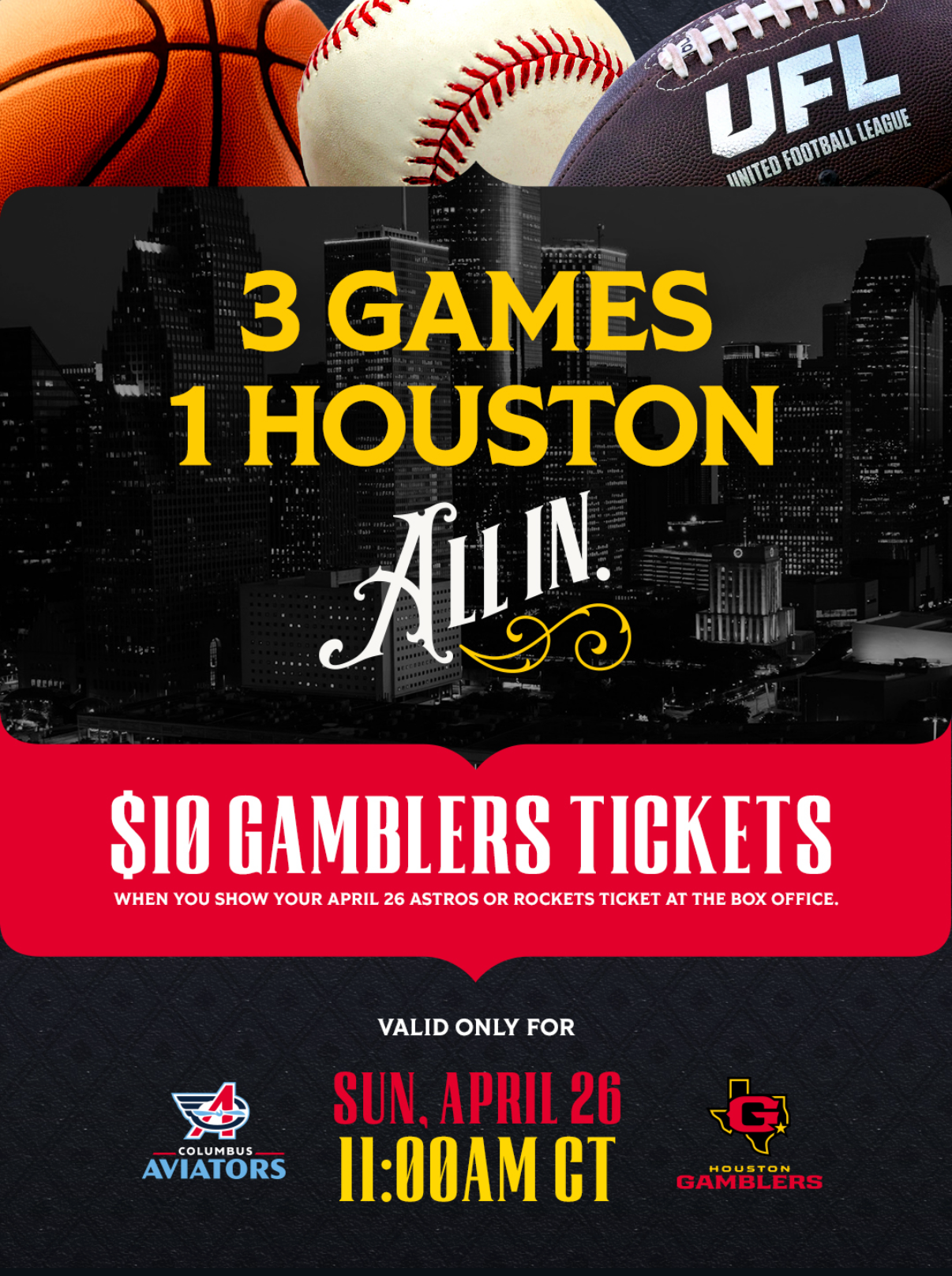 The United Football League is bringing an exciting multi-sport crossover promotion to Houston, and it all leads up to a can’t-miss showdown on April 26. The Houston Gamblers will host the Columbus Aviators in a late-morning matchup that blends spring football intensity with the energy of Houston’s broader sports scene.