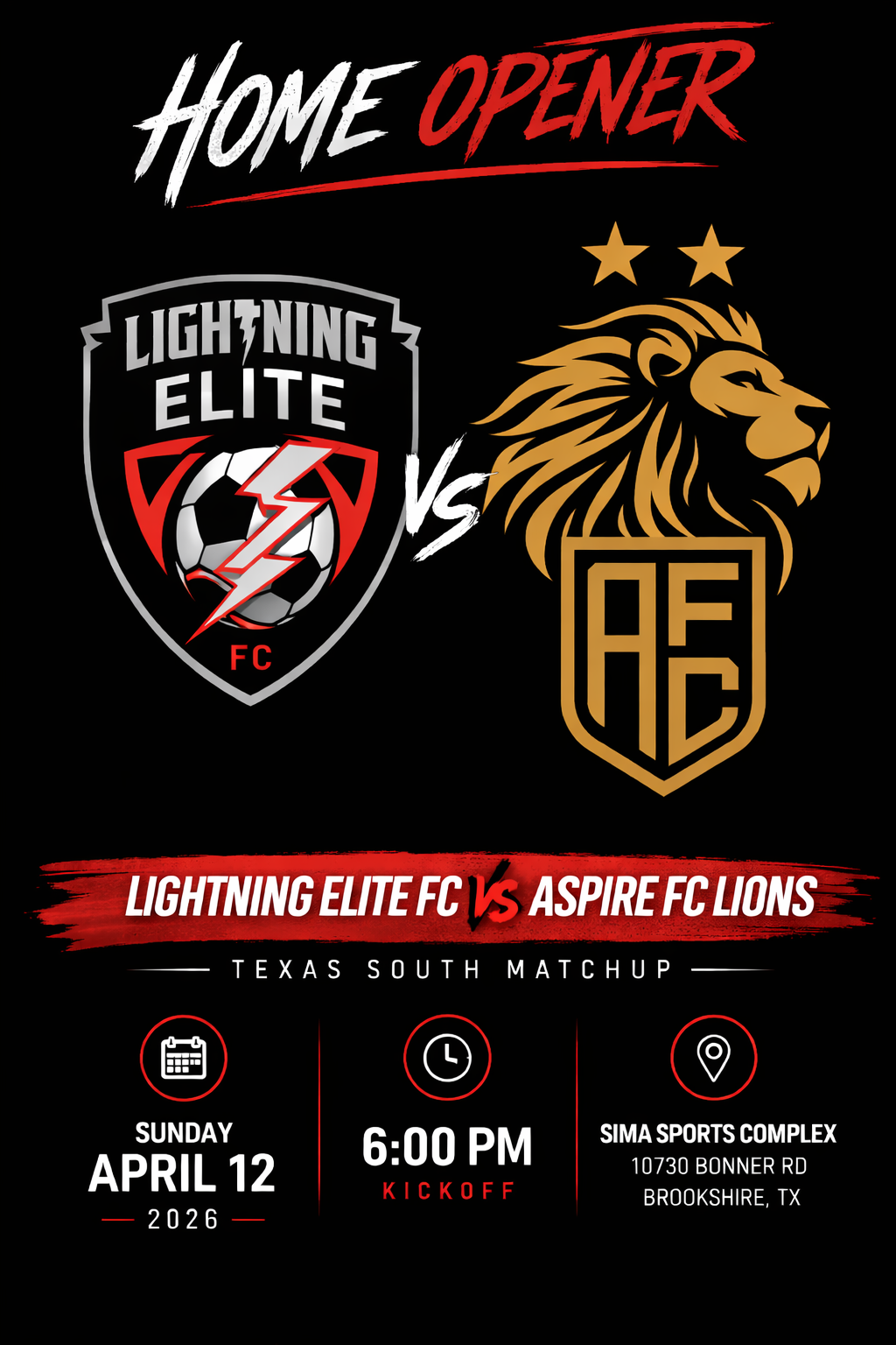 Lightning Elite FC is set for a big night at home on Sunday, April 12, 2026, as the club welcomes Aspire FC Lions to Sima Sports Complex for a Texas South matchup. UPSL lists this as Lightning Elite’s season opener, while Aspire enters after opening the spring with a draw against SVD Beaumont and a match against Katy Jaguars FC.
