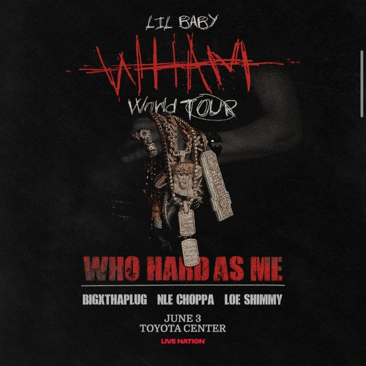 WHO’S READY?! Lil Baby is bringing his highly anticipated WHAM WORLD TOUR to Toyota Center on June 3, delivering an unforgettable night of hip-hop energy! Joining him are special guests BigXthaPlug, NLE Choppa, and Loe Shimmy, making this a must-see show for rap fans.