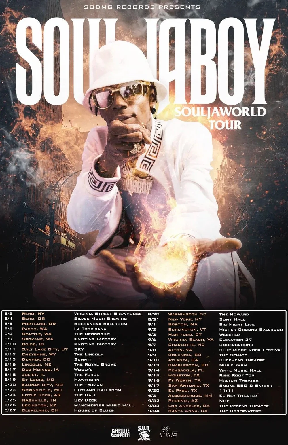 The Swag Tour showcases Soulja Boy's influential contributions to hip-hop, featuring hits like "Crank That (Soulja Boy)," "Kiss Me Thru the Phone," and "Pretty Boy Swag." Known for his engaging performances, Soulja Boy promises an unforgettable concert experience.