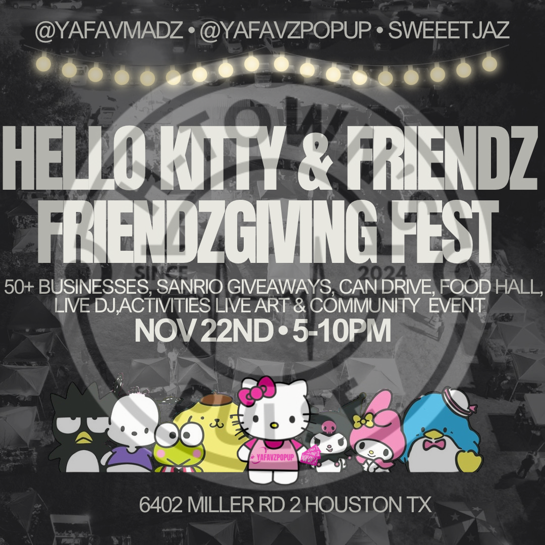 H-Town Pulse is excited to sponsor and cover the Hello Kitty & Friendz Friendzgiving Fest by @yafavpopup on November 22nd from 5 to 10 PM! This festive community event will feature over 50 local businesses showcasing unique Hello Kitty-inspired items, handmade goods, and vintage treasures. Attendees can enjoy Sanrio giveaways, a food hall with delicious options, and a live DJ spinning tunes throughout the evening. Plus, there will be a can drive benefiting the Houston Food Bank, so bring your canned goods to support those in need. With engaging activities and live art performances, this event promises fun for all ages. Join us as we celebrate creativity and community at this must-attend gathering!