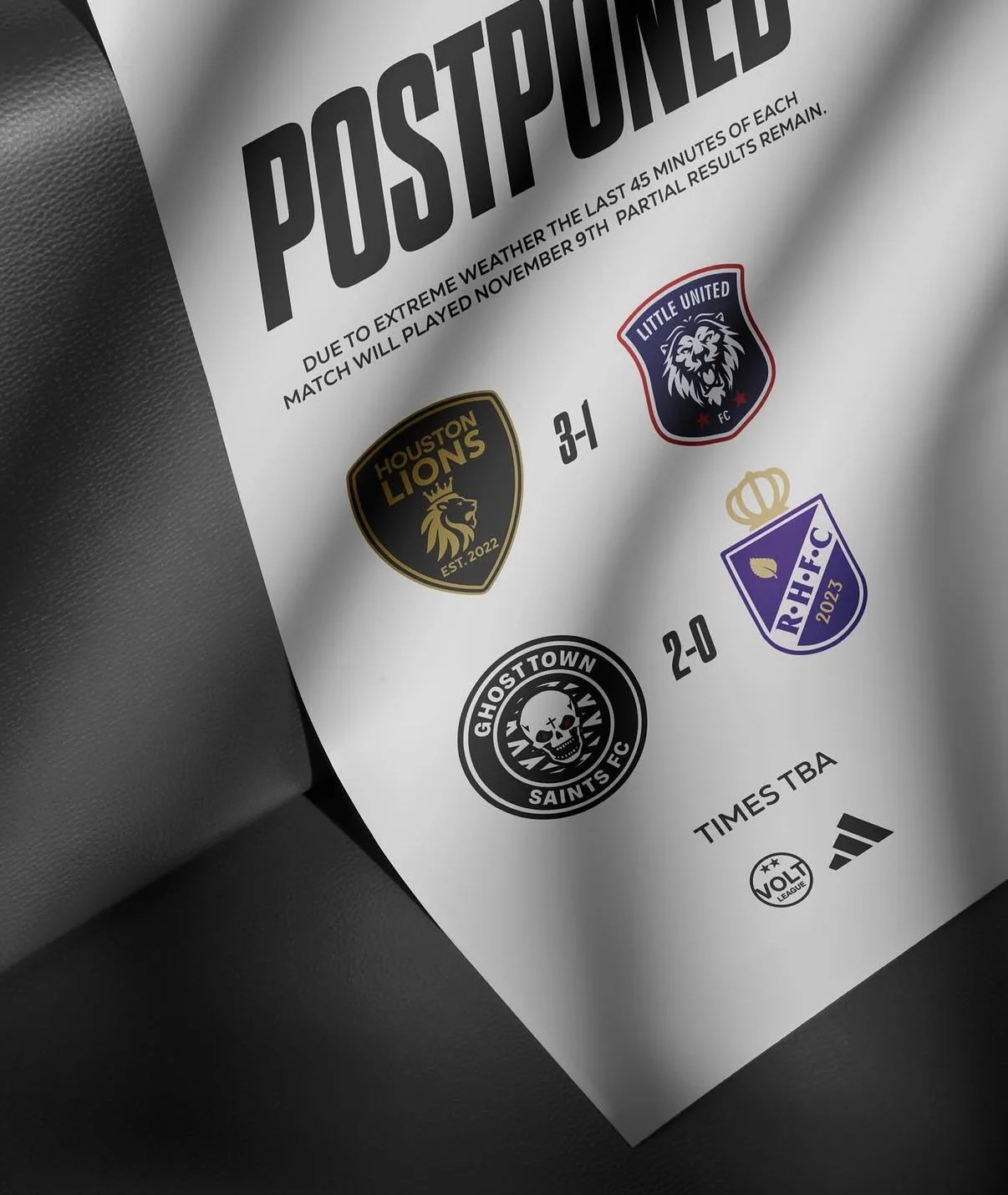 Lions restart with a 3-1 lead after a dominant first-half performance before the postponement. Little United will have to press high and capitalize quickly to change the result, while the Lions aim to protect their cushion and close out the win.6:00 PM – Ghosttown Saints FC vs Real Houston FC